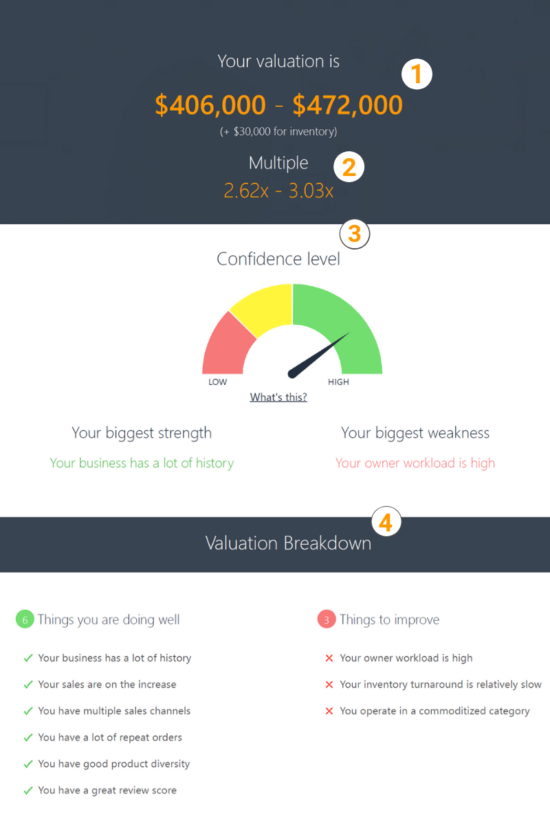 As its most important component, the valuation tool will provide you the value range of your Amazon FBA business.
